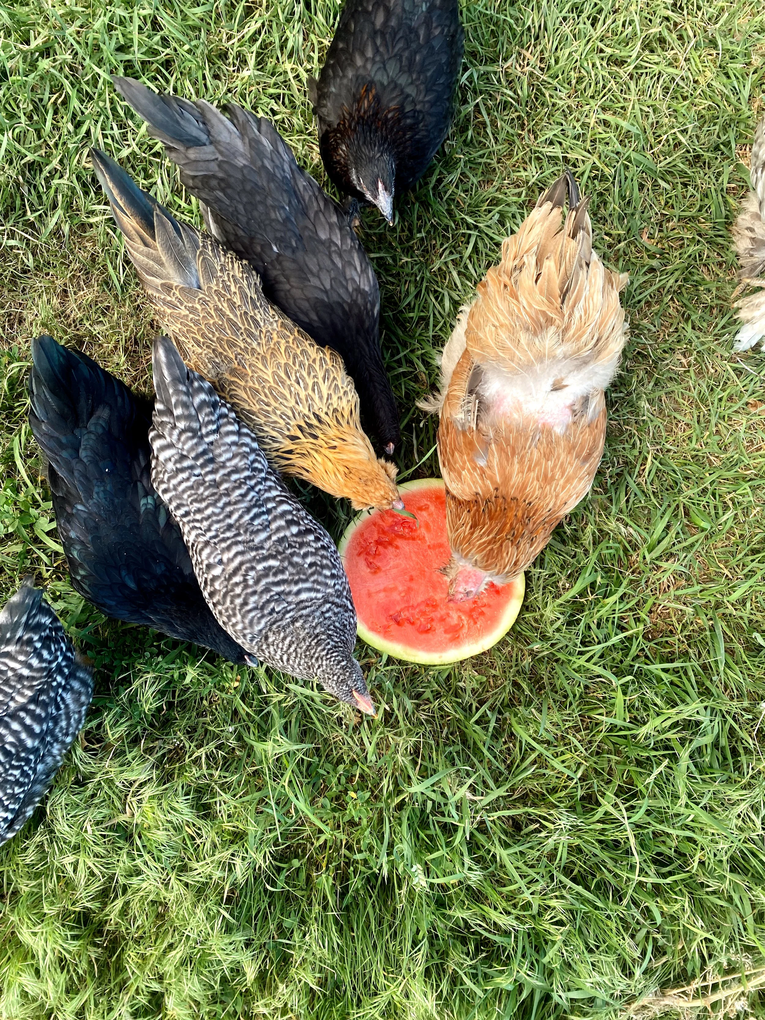 Frozen treats are a great way to help your chickens cool down. You can freeze fruits and vegetables, such as berries or peas, and offer them to your flock. Chickens love pecking at these icy snacks, and it helps them lower their body temperature. I will also provide the chickens with a smoothie from time to time. I just give them our leftovers, add in some whole veggies and fruit and they love it! Watermelon, zucchini and cucumbers are also great snacks on their own since they have a high water content. My chickens love watermelon and we always have extra squash from the garden to give them during the summer months. Additionally, you can freeze water in shallow containers and place them in the run. As the ice melts, it provides a cool surface for the chickens to stand on or drink from.
